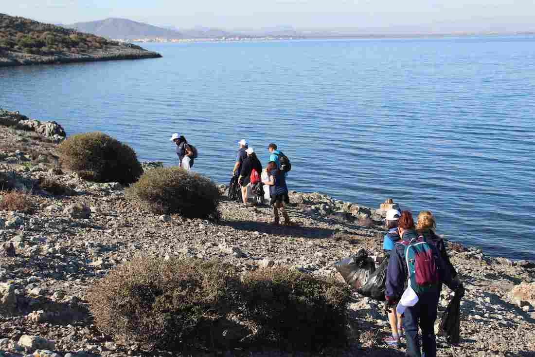 En una acción conjunta, y con el objetivo de preservar el ecosistema y el medio ambiente, una veintena de voluntarios se ha lanzado al agua para recoger cientos de residuos esparcidos por la superficie de la isla del Mar Menor.