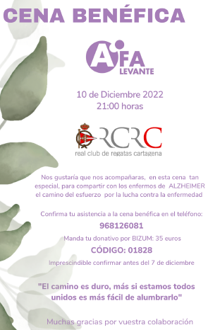 La asociación sin ánimo de lucro que da apoyo a los familiares y cuidadores de personas con alzhéimer y otras demencias neurodegenerativas recupera, tras el parón pandémico, este encuentro para el 10 de diciembre a las 21 horas en el Real Club de Regatas de Cartagena, pudiendo participar los ciudadanos que quieran colaborar con la labor del colectivo.