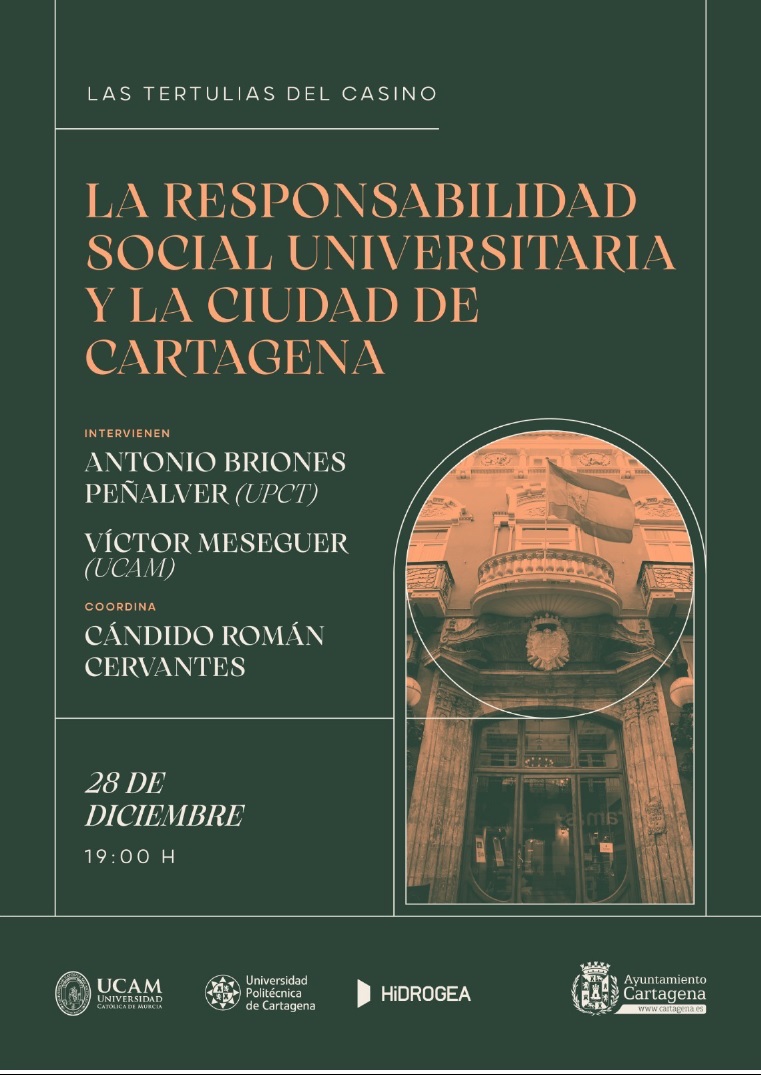 Briones Peñalver (UPCT) y Víctor Meseguer (UCAM) hablarán, en una tertulia coordinada por Cándido Román Cervantes, sobre ‘La responsbilidad social universitaria y la ciudad de Cartagena’ el 28 de diciembre a las 19 horas. El acto cuenta con el apoyo de ambas universidades, además de Hidrogea y del Ayuntamiento de Cartagena.