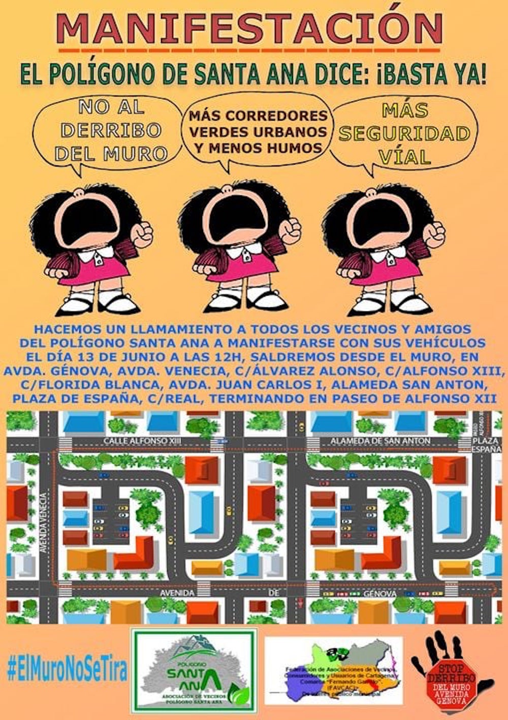 El 13 de junio llevará a cabo con vehículos una protesta contra el derribo del muro de la avenida de Génova, comenzando la ruta a las 12 horas desde ese mismo enclave para después salir de la barriada, cruzar Los Dolores y San Antón hasta llegar a la ciudad, culminando la ruta en el paseo de Alfonso XIII. Los convocantes son la Asociación de Vecinos del Polígono de Santa Ana y la Federación de Asociaciones de Vecinos de Cartagena y Comarca.