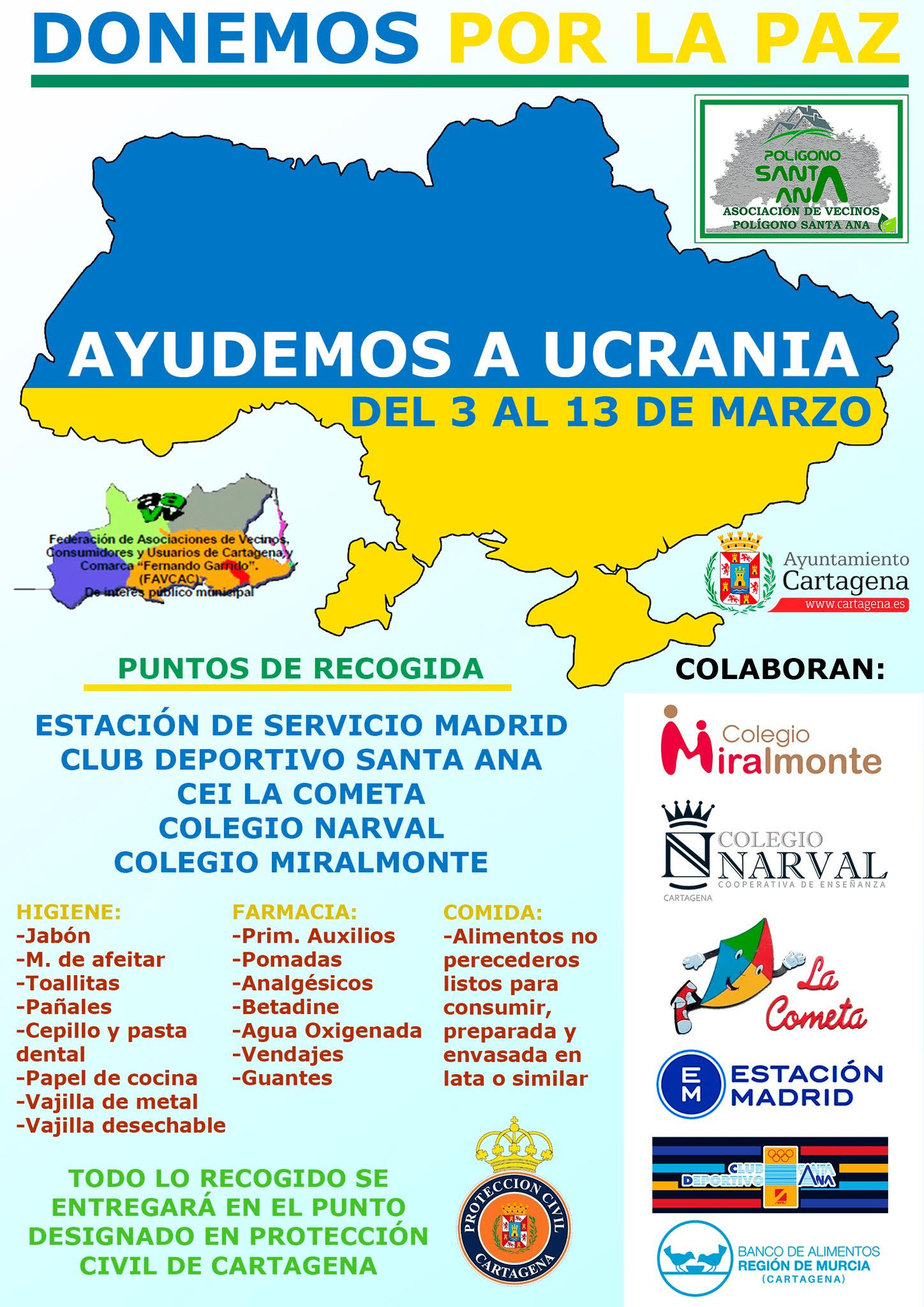 La Asociación de Vecinos del Polígono de Santa Ana realizará del 3 al 13 de marzo una campaña de recogida de alimentos, material sanitario y medicamentos para ayudar a paliar las necesidades que tiene la población de Ucrania debido a la guerra.