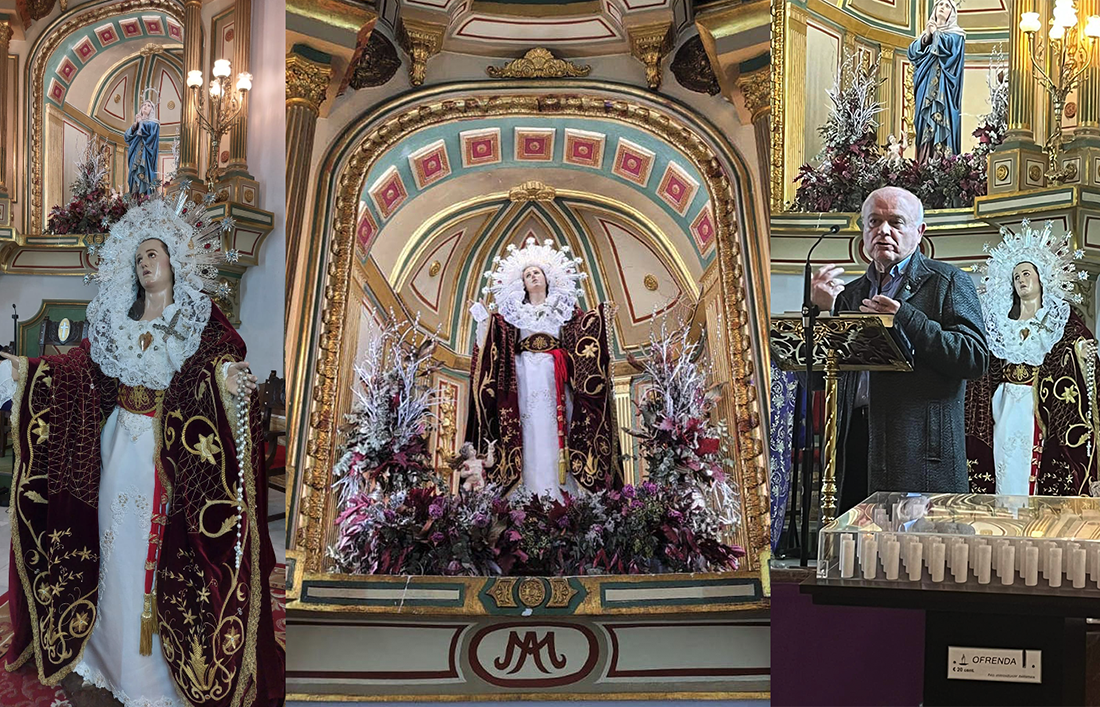 La imagen titular de Nuestra Señora de los Dolores del barrio cartagenero del mismo nombre se encuentra en proceso de restauración, siendo la talla que sale en romería la que ocupa su lugar en el altar y la que hoy ha ‘contemplado’ la jornada de cariño que ha recibido la imagen de Jesús Medinaceli por parte de fieles y de alumnos del colegio del Sagrado Corazón.