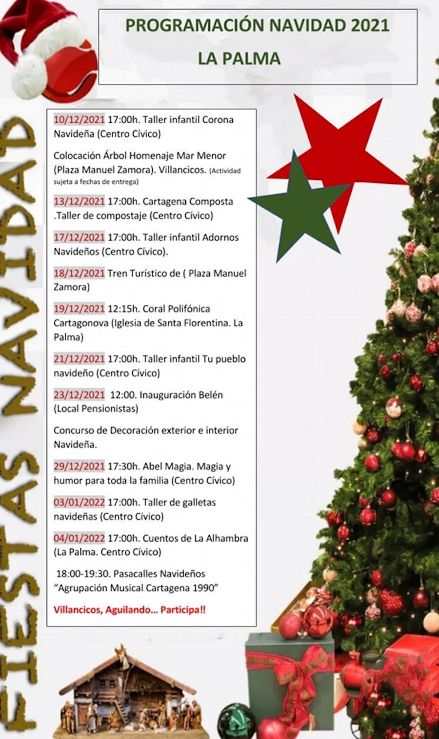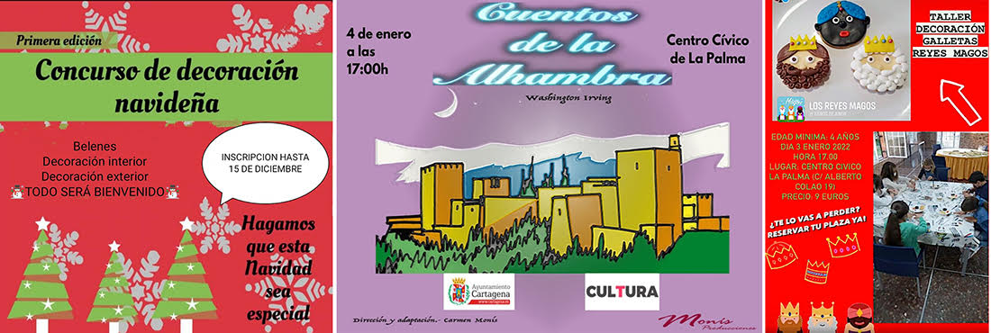La Palma ya está en puertas de iniciar su programa de actividades navideñas. El viernes, a las 17 horas habrá un taller infantil sobre corona navideña en el centro cívico. El día 13 se ha organizado un taller de compostaje, mientras que el 17 habrá un taller infantil sobre adornos navideños. El 19 de diciembre, a las 12.15 horas en la iglesia de Santa Florentina de La Palma actuará la coral Polifónica y el 23 de diciembre se inaugurará el Belén en el local de los pensionistas y habrá un concurso de decoración navideña.