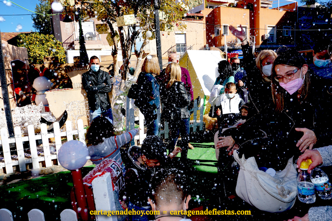 Igualmente, se ha inaugurado el poblado, con bastantes novedades, como es el muro que lo separa del Belén, dos casetas más para los elfos (otro taller y una segunda casa) y los personajes de Papá Noël con movimiento y dos populares de la película 'Frozen': el muñeco de nieve Olaf y el reno Sven, éste ubicado bajo un techado también novedoso. No han faltado los lanzamientos de nieve ni el gran árbol navideño. En horario nocturno también lucirá el colorido y variado alumbrado.