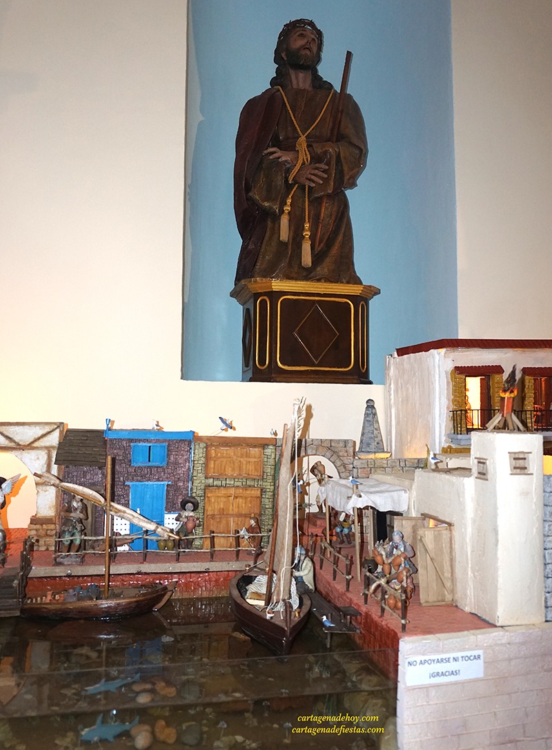 Belén con elementos del barrio, como la iglesia, el Pinacho y el puerto con barcos latinos. Además se invita a los que acudan a jugar buscando un 'ratón' que está escondido: