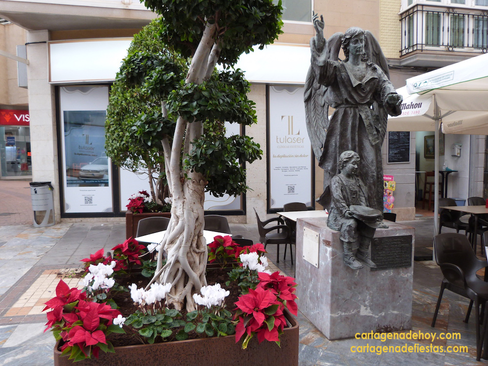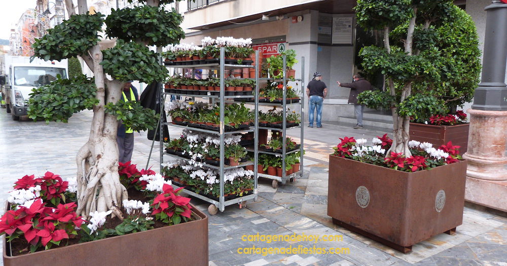 La concejalía de Parques y Jardines está llevando a cabo la instalación de flores típicas de estas fechas en el centro urbano de Cartagena, como se observa en las imágenes captadas en la calle del Carmen.