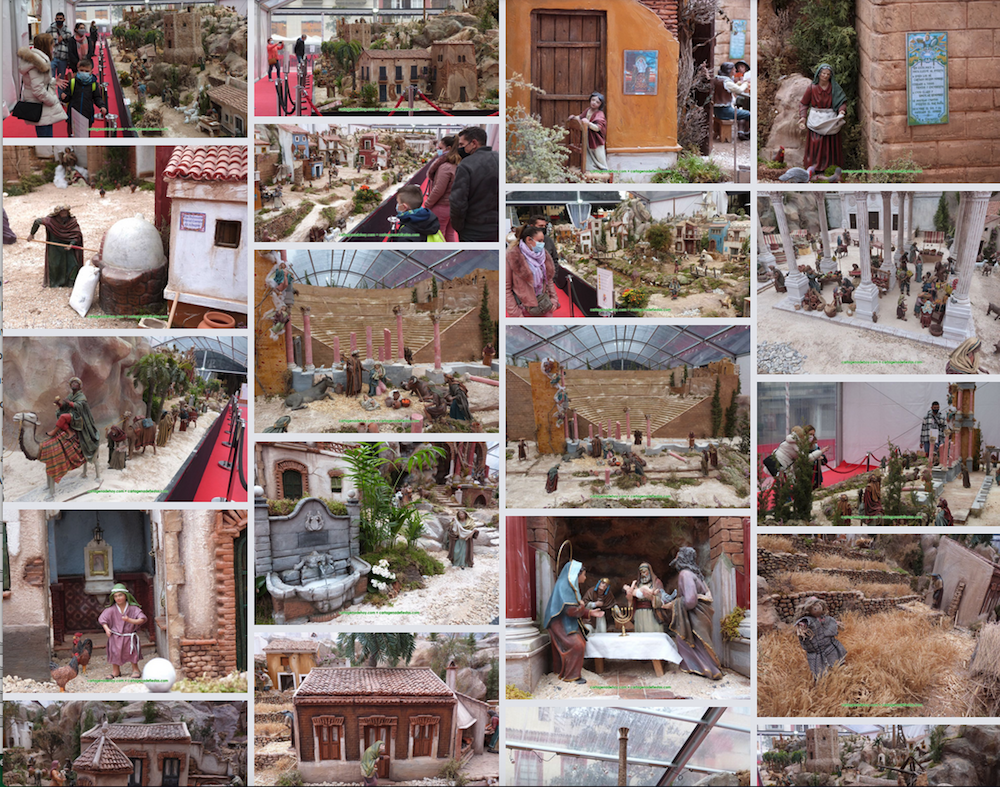 El monumental Belén municipal (120 metros cuadrados y 500 figuras) presenta este año bastantes novedades, como el monumento del Teatro Romano (lugar junto al que se sitúa el nacimiento de Jesús) y los azulejos típicos de las paredes del casco histórico con imágenes de la Semana Santa (en este caso, la Virgen con sus variantes marrajas), el Jesús del callejón de la Soledad o el dedicado a Miguel de Cervantes, que se reproducen en diferentes fachadas de este gran montaje. También se ha estrenado una plaza dedicada a José Garnés, puntal de la asociación belenista de El Albujón fallecido en 2019.