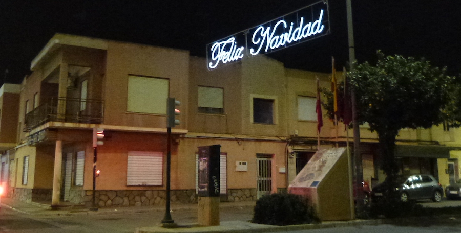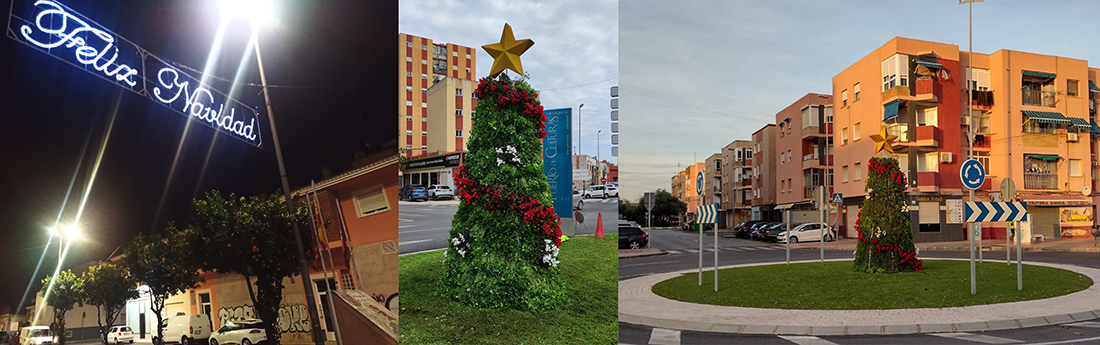 Este año se están multiplicando los adornos de Navidad en las calles del municipio, como en la barriada San Cristóbal, donde es novedad el cartel luminoso de 'Felices fiestas', mientras, árboles adornados 'brotan' en las plaza Alicante y de la barriada de San Ginés, habiendo sido instalados por la concejalía de Festejos.