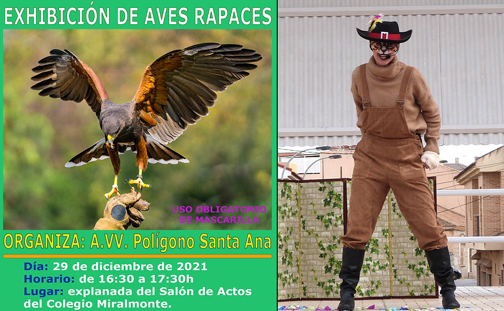 Una exhibición de aves en la explanada interior del colegio Miralmonte será, desde las 16.30 y durante una hora, la antesala del cuentacuentos del ‘Gato con botas’ que se ofrece en la barriada de Cartagena Norte, dentro del programa organizado por la comisión de fiestas en colaboración con la concejalía de Festejos, la asociación de vecinos y la revista ‘El Puente’, en el 15 aniversario de la revista.