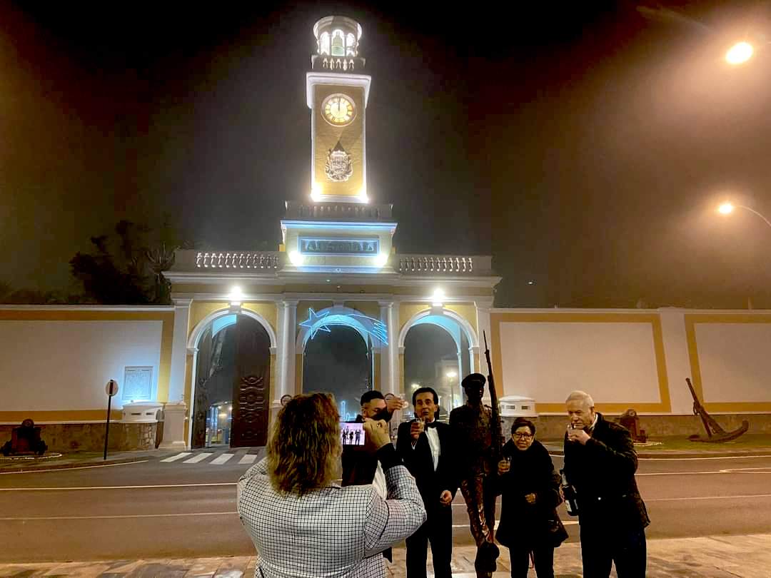 En la foto se les observa junto al monumento dedicado a la Infantería de Marina junto a otro asistente y al locutor Gaspar Zamora, quien estaba enviando un mensaje a las televisiones locales por cable de España.