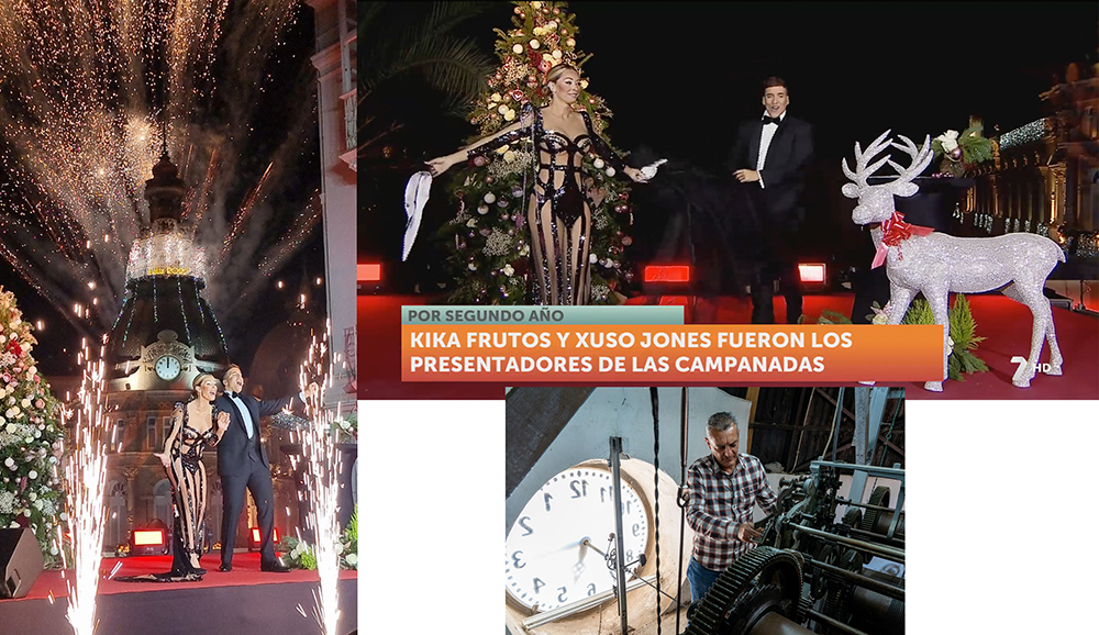 Desde Cartagena, con el reloj del Palacio Consistorial, Xuso Jones y Kika Frutos despidieron 2021 y le dieron la bienvenida a 2022 en un cambio de año que culminó con un espectáculo de fuegos de artificio, como se pudo ver a través de la televisión autonómica 7RM. No pudo asistir público (aunque sí hubo algunos que se acercaron a la plaza del Ayuntamiento) debido a la situación pandémica y el deseo es que el próximo 31 de diciembre esta cita se enriquezca con la presencia de los ciudadanos.