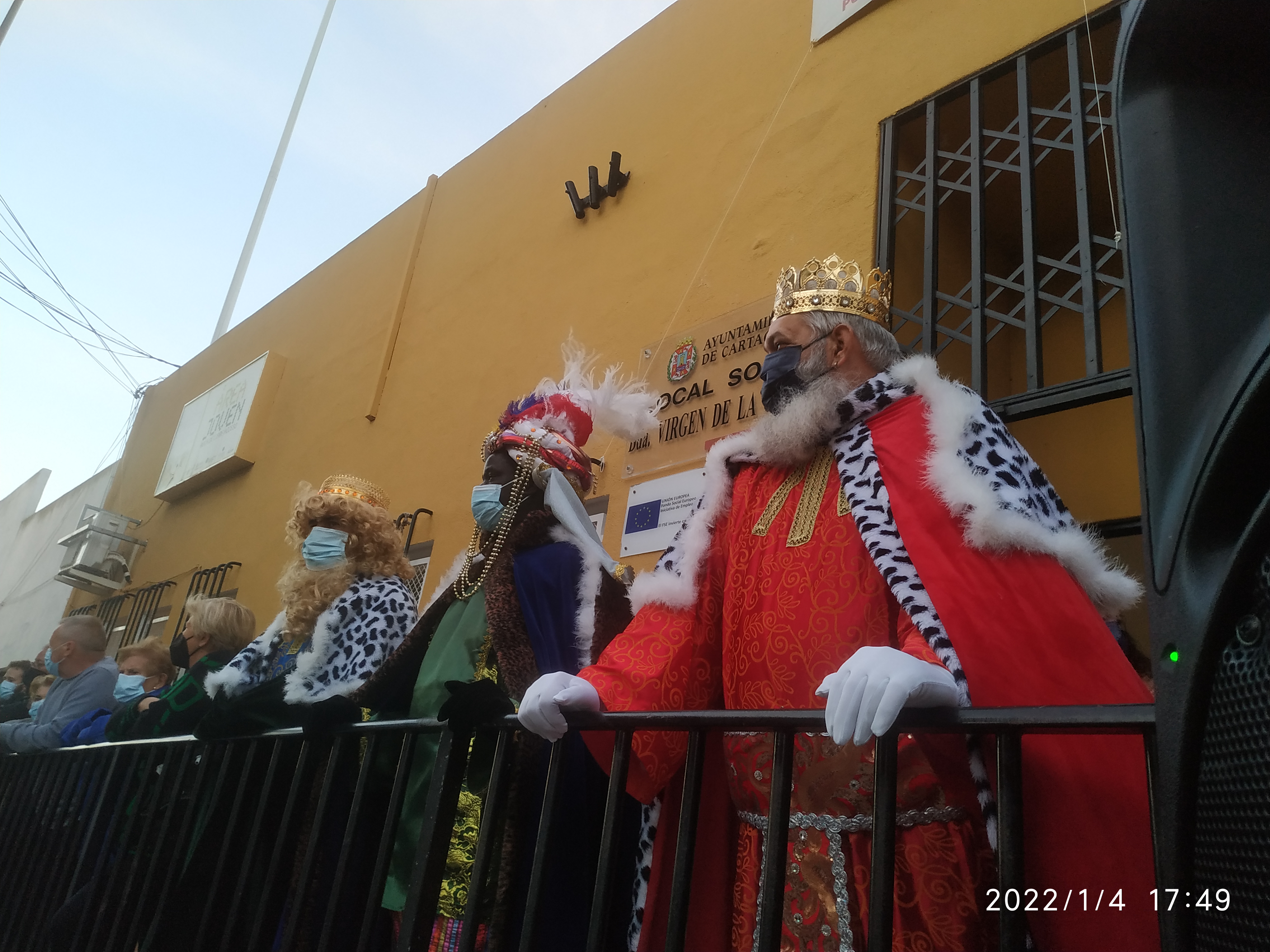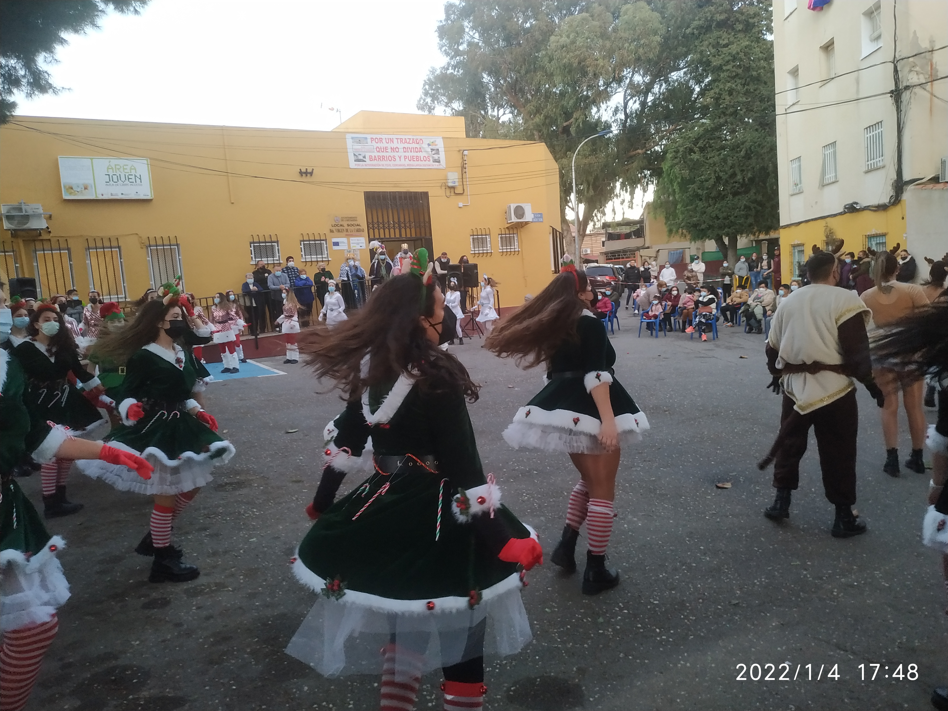 Los Reyes Magos han llevado la ilusión a la barriada Virgen de la Caridad en una jornada en la que ha actuado el grupo de baile Renacer. Al principio iba a ser un pasacalles, pero ante la situación provocada por la pandemia, los organizadores decidieron que se realizara un espectáculo estático.