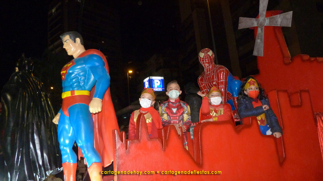 El primer grupo del desfile lo formaban cuatro coches de los animosos amigos del Seat 600, para después, con bastante distancia, comenzar a llegar bandas de música (ataviados con adornos y disfraces para la ocasión) y carrozas, la cuales han tenido una temática principalmente centrada en las historias Disney, aderezada con los superhéroes de la Liga de la Justicia, siendo niños (y algunos mayores) de diferentes colectivos vecinales (La Vaguada, San Cristóbal, Trinidad, Ensanche-Almarjal, Ramón y Cajal, Virgen de la Caridad…) sus ‘tripulantes’. También han formado parte del cortejo un gran camello llegado de San Vicente de Raspeig y la carroza de El Corte Inglés. Como es habitual, cerraban Melchor, Gaspar y Baltasar, esta vez lanzando saludos y algunos besos ante la imposibilidad de utilizar objetos para agradecer los aplausos constantes que recibían de una multitud, pues si eran 18.000 las sillas ocupadas, la cifra de asistentes habría que elevarla en bastante más por las numerosas personas que han estado de pie. Eso sí, en momento alguno se ha tenido la sensación de aglomeración en el recorrido. Por cierto, unos veinte minutos ha durado el paso de toda la comitiva por cada punto. Además de los mentados, también han formado parte de esta cabalgata policías locales (abriendo paso con tres motoristas), voluntarios de Protección Civil, policías nacionales, técnicos, integrantes de colectivos vecinales, sanitarios, bomberos…