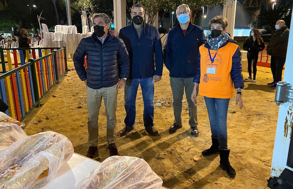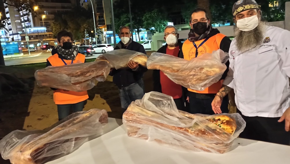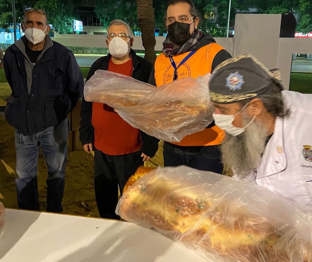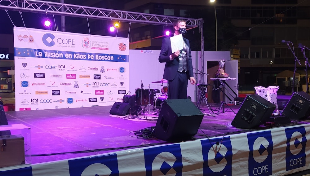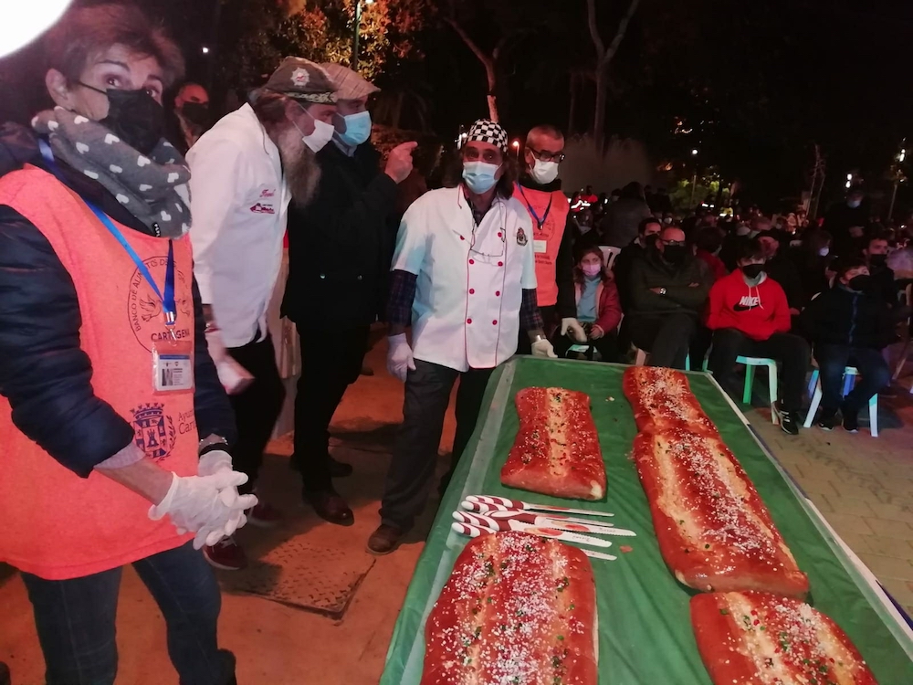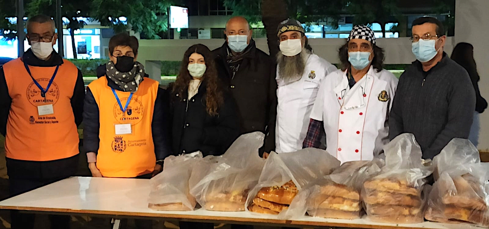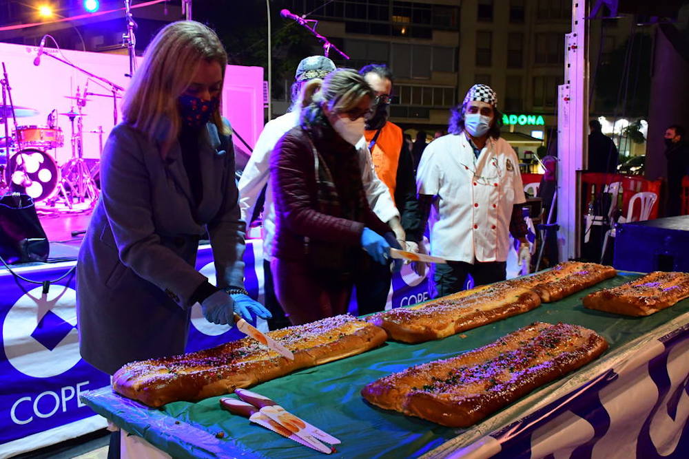 La actividad navideña en la plaza de España tuvo un extra con la velada del roscón gigante organizada por Cope Cartagena, que contó con la actuación del grupo ‘Adiós noviembre’ y del mago ‘Abel magia’, además del majestuoso dulce de Reyes Magos laborado por voluntarios del Banco de Alimentos de la Región de Murcia de Cartagena, que fue distribuido, con ayuda de las ediles María Casajús y Cristina Pérez, entre asistentes y que también tendrá como destino la Hospitalidad de Santa Teresa, Cáritas, Hermanistas de los Pobres y El Buen Samaritano.