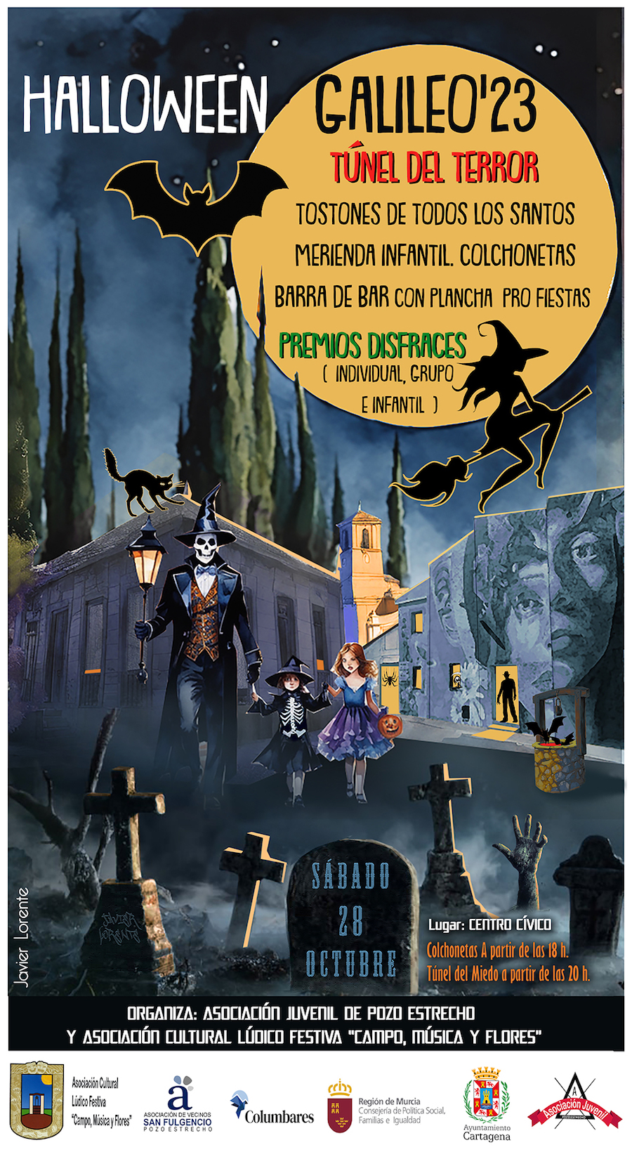 La fiesta galilea con motivo de la llegada de 'Halloween' tendrá lugar el sábado día 28 en el centro cívico, con tostones, merienda ifnatil, colchonetas, cantina con plancha para ayudas a las fiestas patronales y el terrorífico circuito. Además, hay premios para los mejores disfraces. Organiza la asociación juvenil y el colectivo 'Campo, música y flores'. El cartel anunciador es obra de Javier Lorente.
