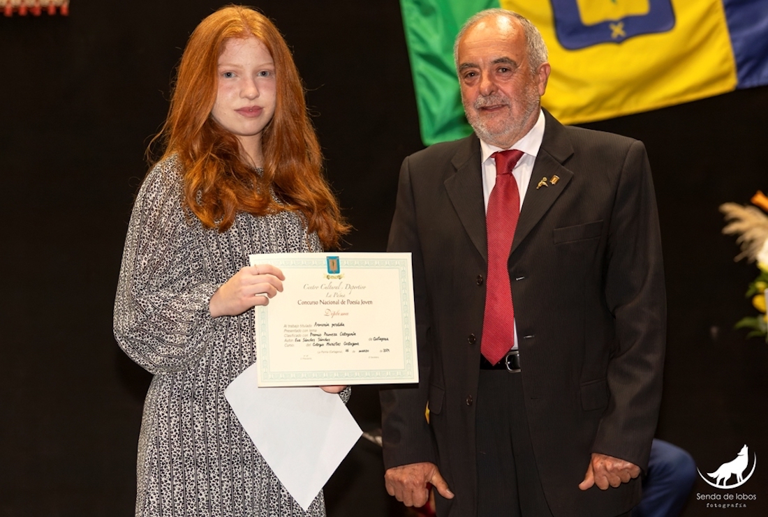 Seguidamente, se procedió a la entrega de los premios del `XXIX Concurso Nacional de Poesía Joven´ para lo cual la presidenta del jurado, Beatriz Moreno, procedió a la lectura del fallo. Los galardones fueron, en la primera categoría, para Eva Sánchez, del Colegio Maristas de Cartagena, por su trabajo “Armonía perdida”; y en la segunda categoría, para Selena Araiz, del IES Carthago Spartaria de La Palma, por su poema “Saber vivir”. Ambas leyeron sus respectivos versos premiados.