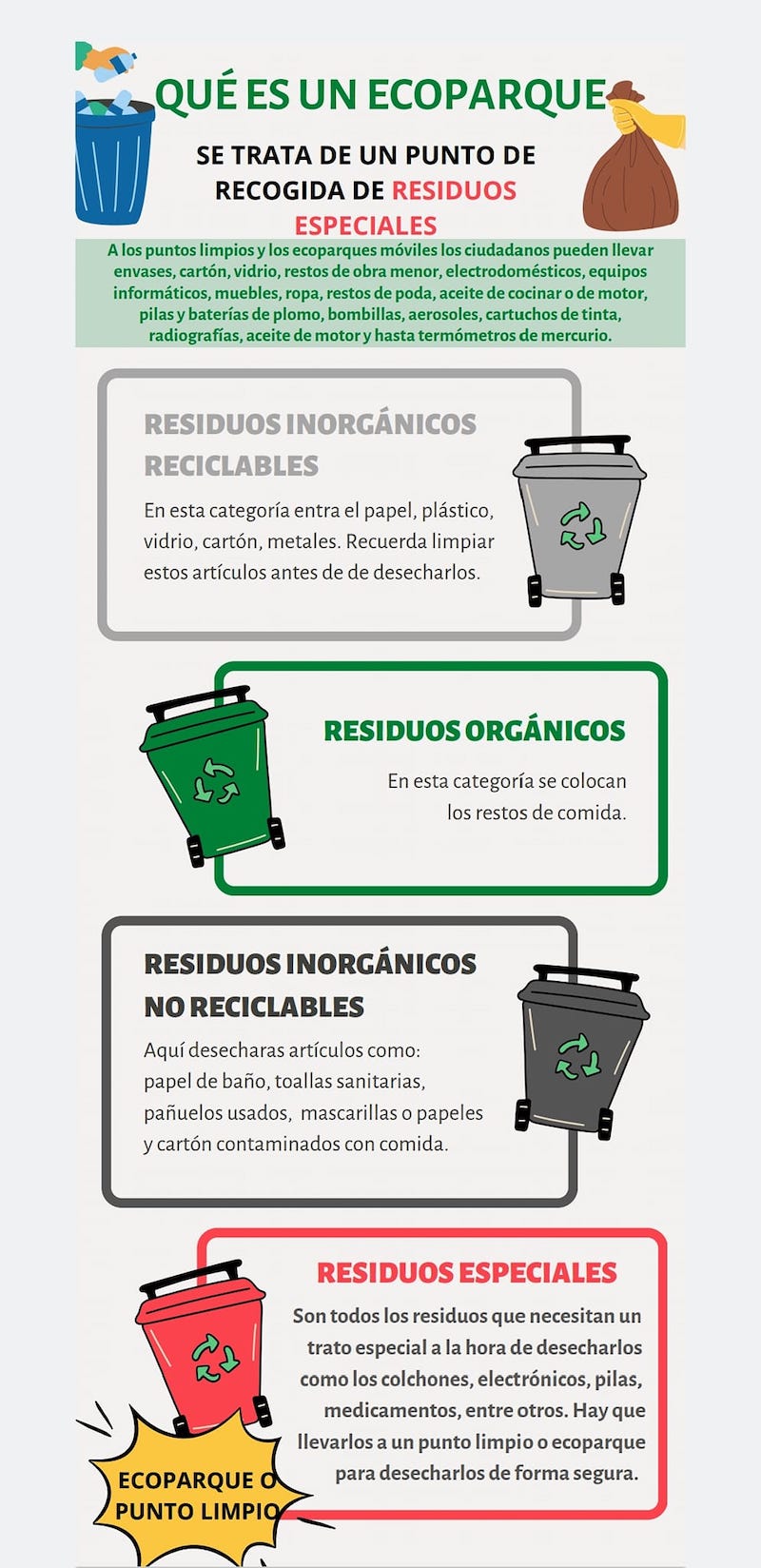 Un ecoparque es un lugar donde se depositan los residuos especiales que necesitan un tratamiento especial para desecharlos de forma segura. Siendo conscientes de la necesidad de disponer de los mismos y siendo conocedores de la intención de instalar uno en zona residencial en Pozo Estrecho, desde la asociacion de vecinos pedimos al Ayuntamiento de Cartagena que se estudie su ubicación en zona industrial adecuada para ese uso.