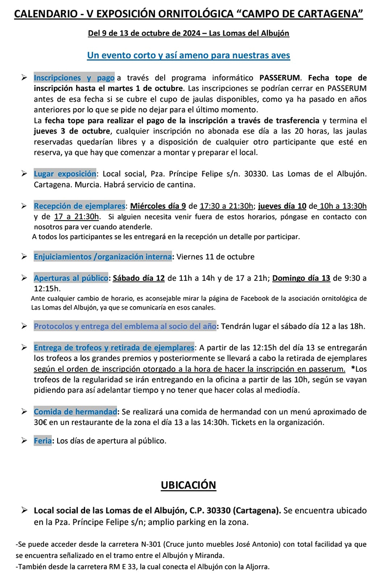 El pasado año la asociación de Las Lomas fue la encargada de organizar el Campeonato Ornitológico de la Región de Murcia en el pabellón de deportes de El Albujón, siendo un gran acontecimiento muy disfrutado por todos los aficionados y vecinos, para este año, esta asociación vuelve a organizar su tradicional exposición del Campo de Cartagena, pero ya será en el local de Las Lomas como siempre ha estado llevando a cabo.