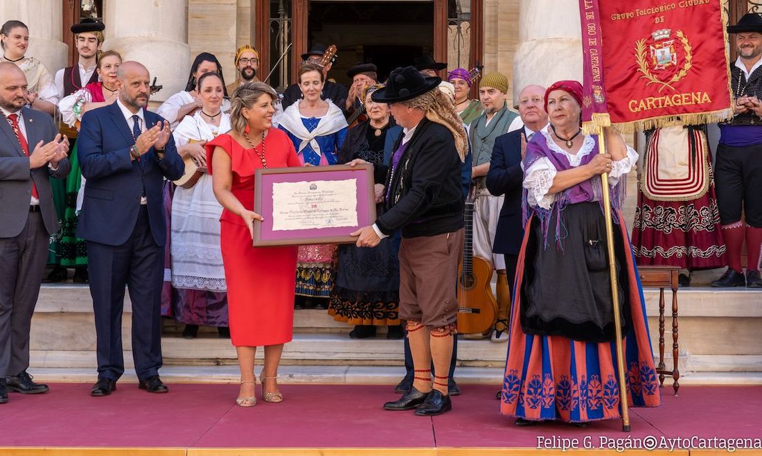 La alcaldesa entregó la distinción al Grupo Folclórico 'Ciudad de Cartagena' por un medio siglo de andadura en el que han evitado que desaparezcan recuerdos de elementos claves de nuestra cultura musical, social, gastronómica y costumbrista.