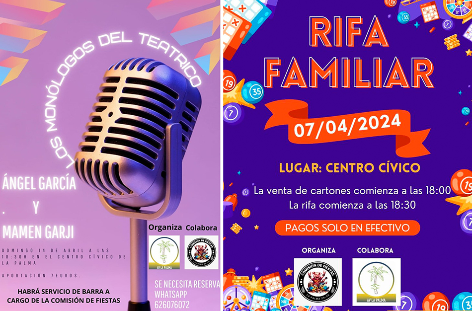 La comisión de fiestas y la asociación de vecinos anuncian que el domingo 14 de abril, a partir de las seis y media de la tarde, el centro cívico recibirá a los humoristas ángel García y Mame Garji. Los interesados deben efectuar reserva previa. Antes, este próximo domingo, a la misma hora, ambos colectivos organizan una rifa familiar.