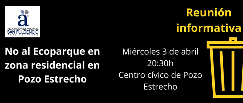 La Asociación de Vecinos San Fulgencio convoca a los residentes a una reunión informativa para esta tarde, a las 20.30 horas en el centro cívico, para abordar la oposición al ecoparque que se pretende construir en zona residencial de Pozo Estrecho y para el que se pide al Ayuntamiento que se traslade a una zona industrial.