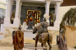 La novedad del montaje de este año es el monte del Calvario con su ermita y un río, principalmente, dentro de una estructura longitudinal cargada de detalles en el que carteles con la cruz de Santiago es el apoyo visual para el espectador.