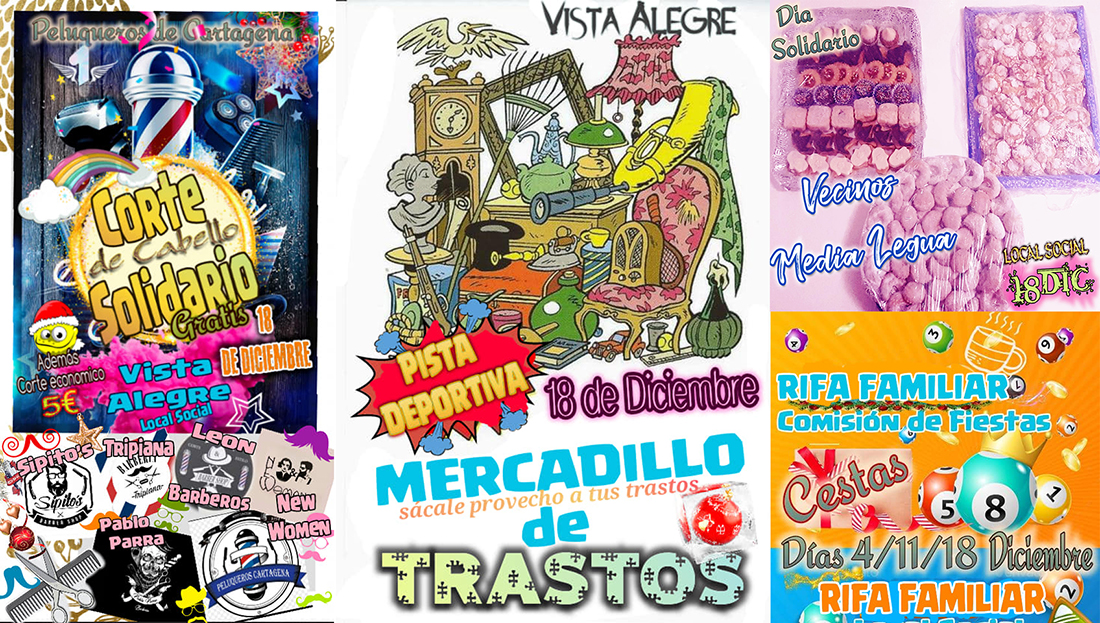 Ayer fue el montaje del Belén natural en el ‘Huerto de los abuelos’ y un pasacalles. Hoy es para la solidaridad, que comienza con cortes de cabello para ambos sexos por 5 euros, mercadillo de trastos y rifa familiar organizada por la comisión de fiestas, además de una degustación de dulces marroquíes de los vecinos de la Media Legua.