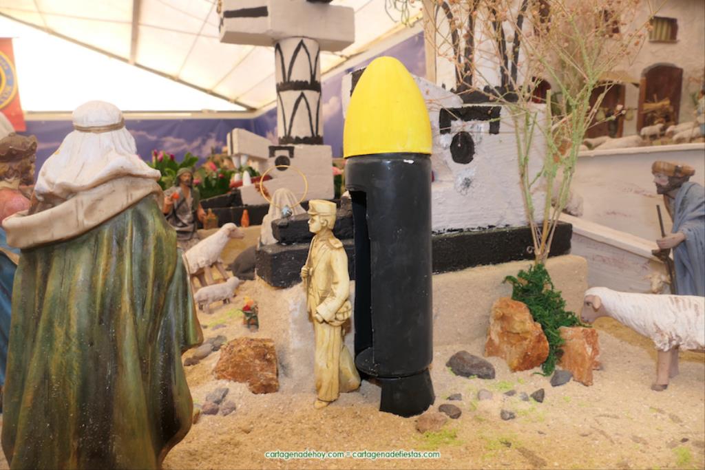 Francisco Pastor, Álvaro Fausto, Antonio Martínez, José Manuel Ayuso, José María García, Antonio Sánchez Pérez y Josiko, el equipo de ‘buenos pastores’ que (junto a Vicente Martín, nueva incorporación) ha levantado el monumental Nacimiento sufrieron el pasado mes de enero la pérdida de Juan Forte Cánovas, otro puntal del equipo, pero no ha impedido que hayan querido seguir sintiendo su compañía con el otorgamiento del título ‘El buen pastor honorífico’ y su presencia simbólica en el montaje. Juan Forte era militar de profesión y, como artillero, prestó en su día servicios de guardia en la Batería de Cenizas, donde se ha habilitado una garita en forma de bala de cañón con un militar ante ella, que es el recordado amigo. En este caso, está montando guardia Jesús, María y José, pues en la batería es donde se encuentra el Nacimiento central.