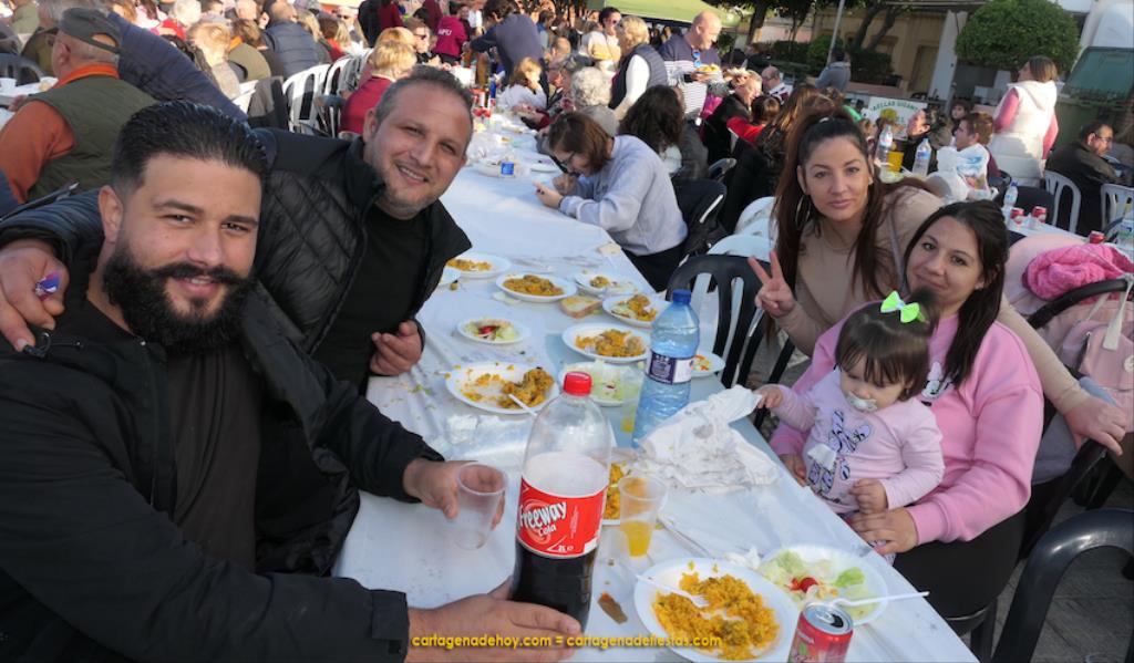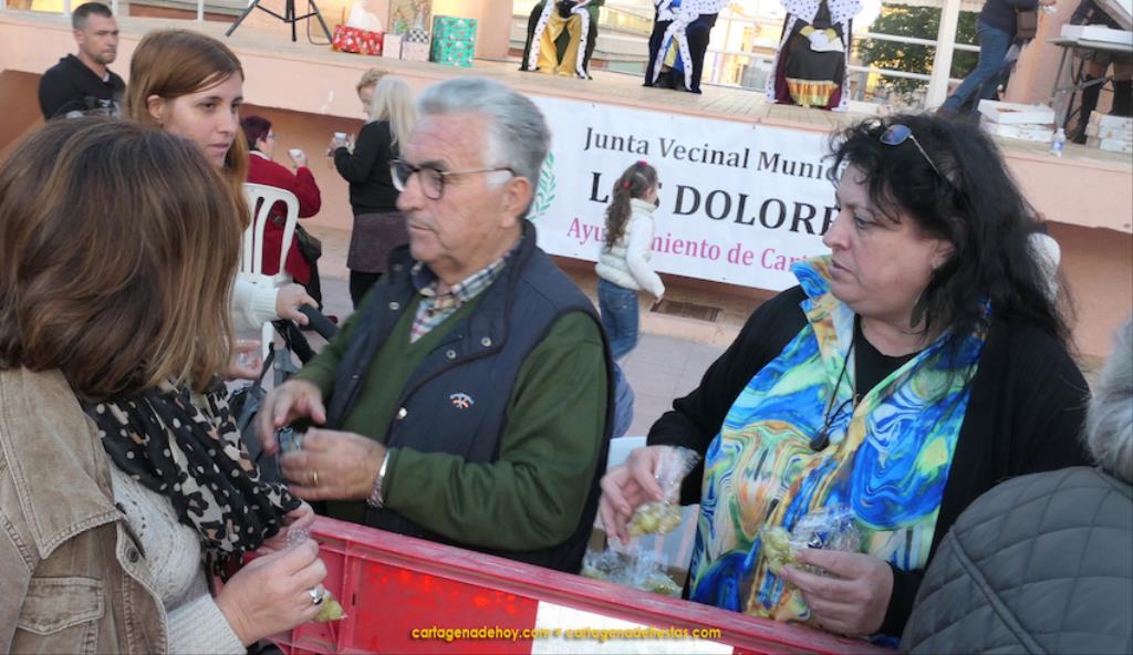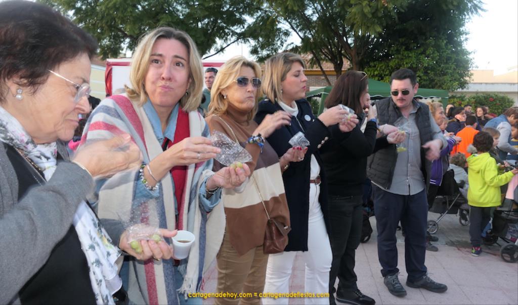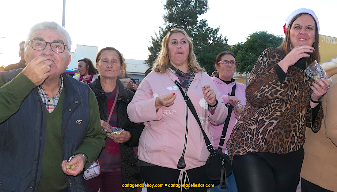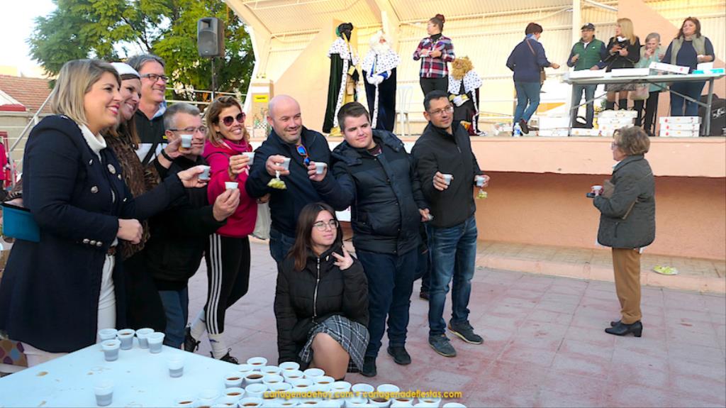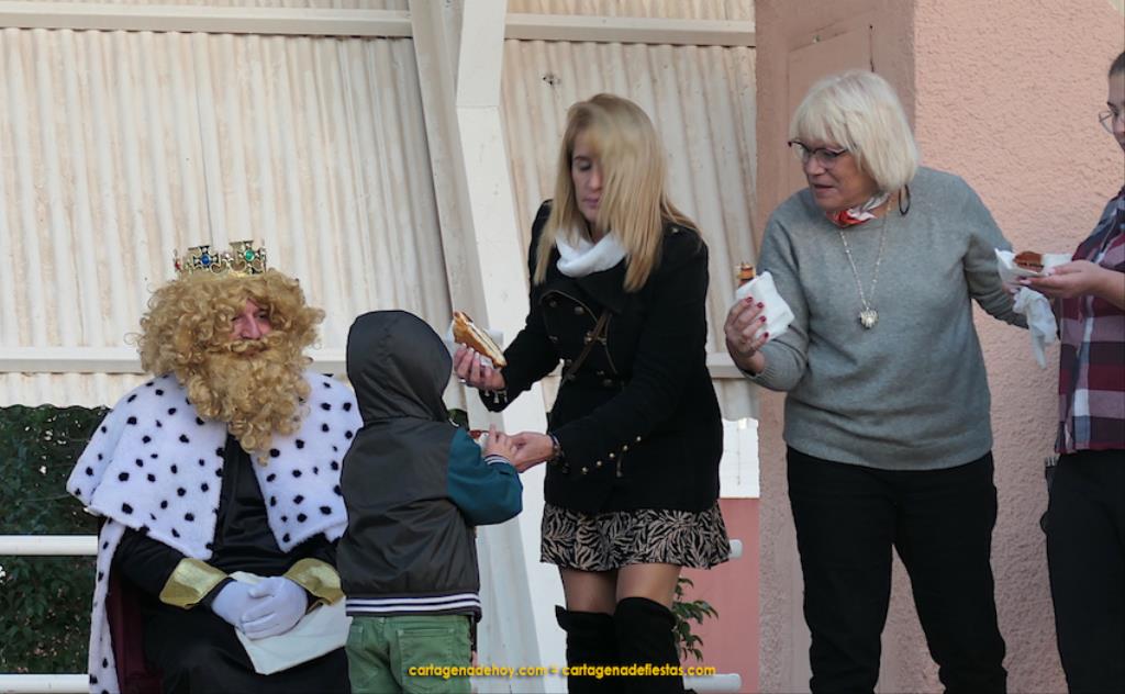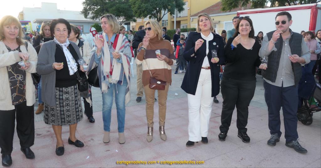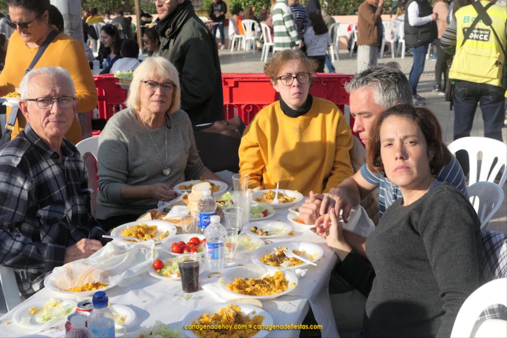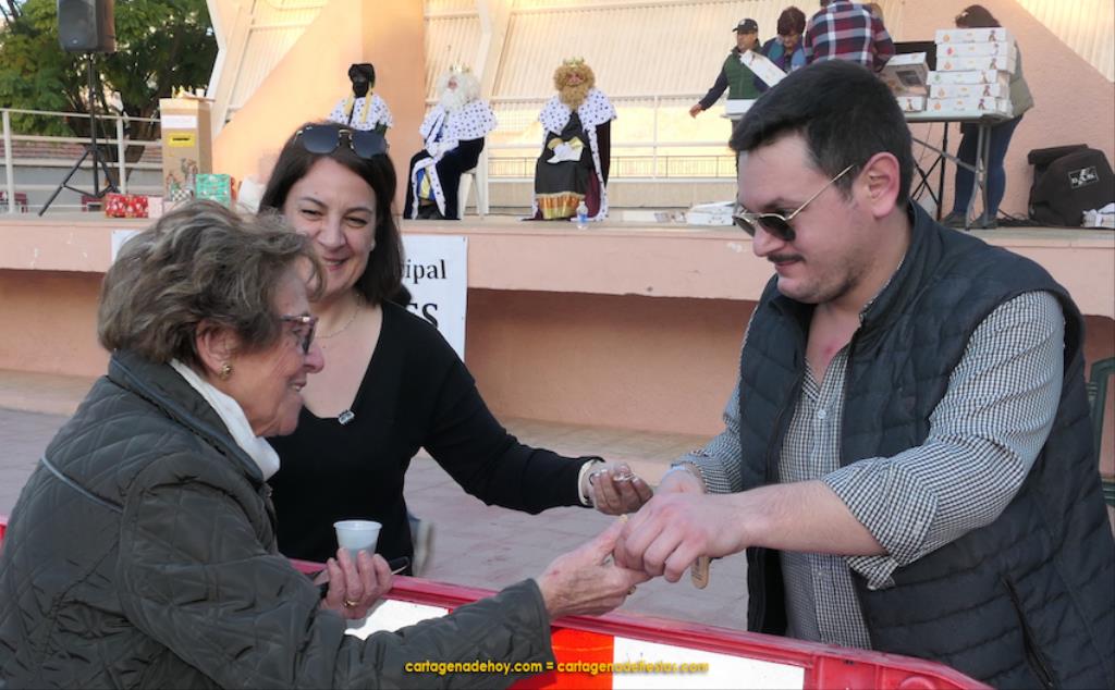 Estuvo la alcaldesa, Noelia Arroyo, durante varias horas, saboreando el arroz, distribuyendo el vino de pasas y tomando sus primeras 12 uvas de esta Navidad. Otros integrantes del equipo político del Ayuntamiento de Cartagena fueron los ediles Cristina Pérez (PP) y de Isabel García y José López (MC). La chiquillería disfrutó con los Reyes Magos y a los adultos se le veía alegría en sus rostros tomando uvas.