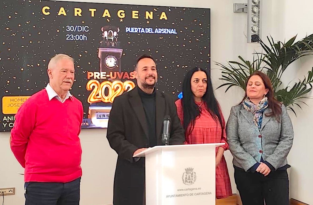La cita prevista para próximo viernes 30 de diciembre en la Plaza del Rey, a partir de las 23:00 horas, frente al reloj del Arsenal, fabricado por José Rodríguez Losada, uno de los más prestigiosos relojeros de la capital británica, ha sido presentada este viernes, 23 de diciembre, por el concejal de Juventud, David Martínez Noguera, la hija de Josefa Muñoz (impulsora de las preuvas en Cartagena y recientemente fallecida), Mari Cruz Rubio Muñoz, la presidenta de Cartagena Futuro, Ana Cristina Martínez, y uno de los organizadores, Antonio Cegarra.