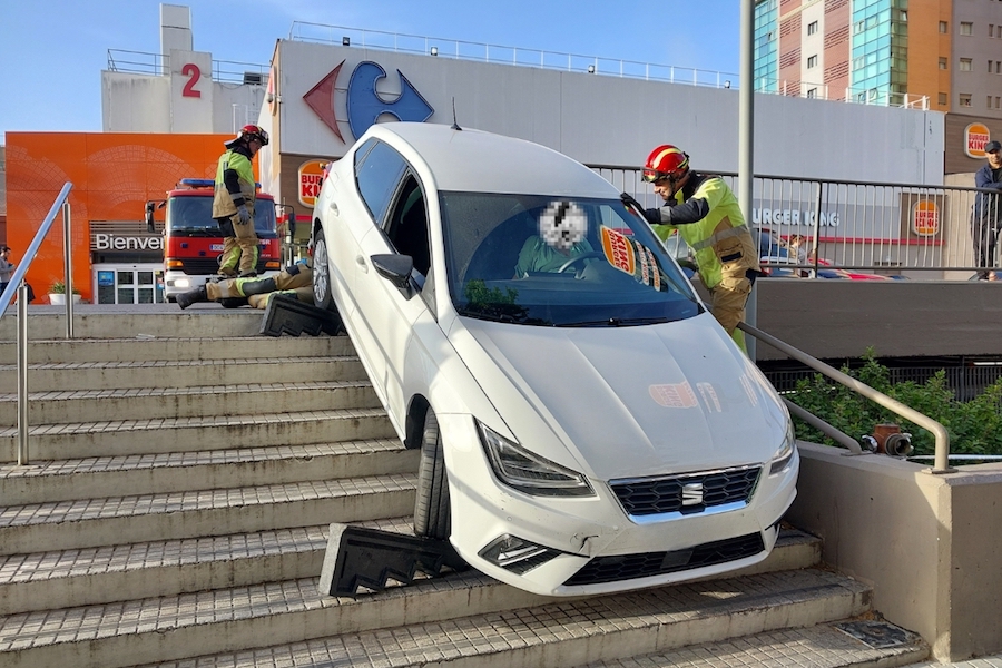 Al llegar al lugar los Bomberos se encontraron que este vehículo, un Seat Ibiza, había quedado en mitad de las escaleras con su conductora en el interior. La conductora tenía el freno de mano echado y pisando el freno. No hubo que lamentar heridos. Los funcionarios del Ayuntamiento de Cartagena colocaron su vehículo detrás del coche siniestrado para fijarlo con una eslinga al cabrestante del camión. Una vez realizada esta maniobra, procedieron a sacar a la mujer del interior por la puerta del acompañante con la ayuda de una tabla de rescate. Una vez fuera del vehículo su conductora, los Bomberos subieron con un cabrestante el coche hasta la explanada exterior del centro comercial.
