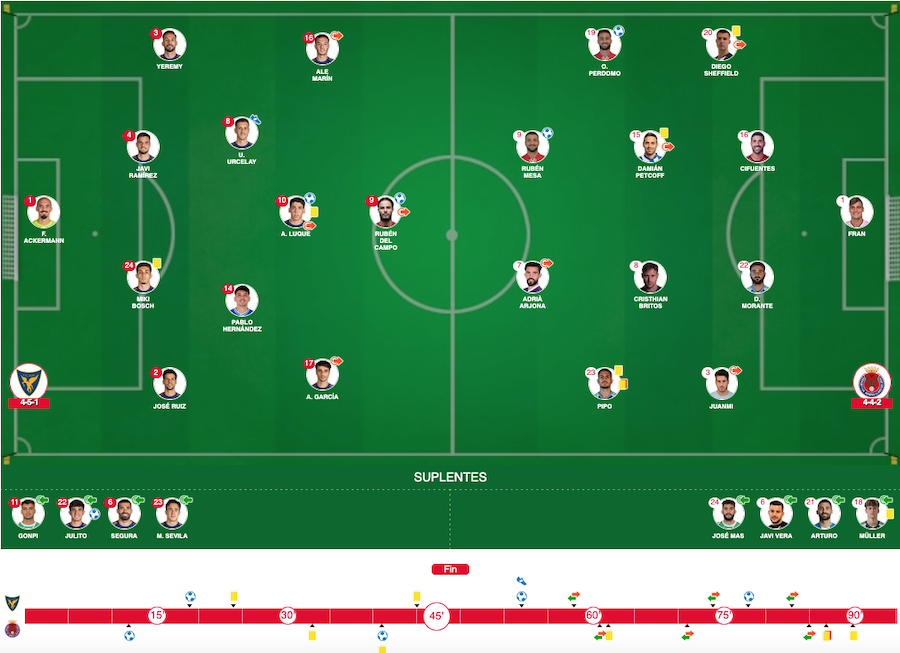GOLES. 0-1. Minuto 14: Omar Perdomo. 1-1. Minuto 20: Luque. 1-2. Minuto 43: Rubén Mesa. 2-2. Minuto 58: Rubén del Campo. 3-2. Minuto 78: Julito.