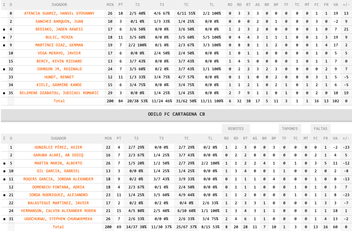 Lo mejor es que, en base a los marcadores de esta jornada final, este partido resultó intranscendente para el orden de la clasificación y Odilo queda séptimo, tal y como estaba ante de la jornada 34. Tizona Burgos perdió ante Obradoiro (100-102) y el duelo directo por una plaza venció Gipuzkoa a Ourense (87-78). Por la zona alta, perdió el Betis en Palencia, con lo que el provisional emparejamiento entre sevillanos y cartageneros de antes de comenzar la jornada se mantuvo.