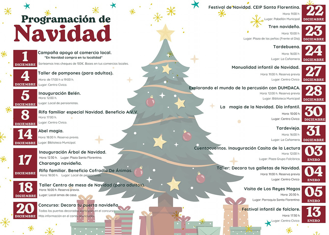 La asociación de vecinos, con la colaboración municipal, ha preparado un amplio programa que comenzó con la puesta en marcha de apoyo al comercio local, que ayer tuvo la inauguración del Belén y que continuará hasta el 13 de enero con la fiesta infantil del folclore, teniendo, entre otras actividades, el estreno del singular árbol, tarde magia, charangas, concurso de decoración de fachadas y puertas, tren navideño, tardebuena, tardevieja, cuentacuentos, talleres y la visita de los Magos de Oriente.