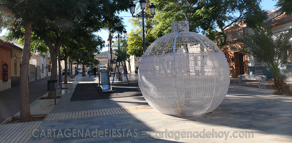 La alcaldesa, Noelia Arroyo, ha destacado que este año Cartagena lleva "la Navidad a todos los barrios y diputaciones" y que el 50% de las actividades navideñas programadas por el Ayuntamiento de Cartagena van destinados a estos lugares. En la foto adjunta, la bola instalada en El Llano del Beal que espera su encendido. Por lo que respecta a la ciudad, ese día habrá cuadrillas y grupos folclóricos recorriendo el centro histórica, mientras que el día 22 será cuando abran al público los dos grandes espacios navideños de Los Juncos y de la plaza de España.
