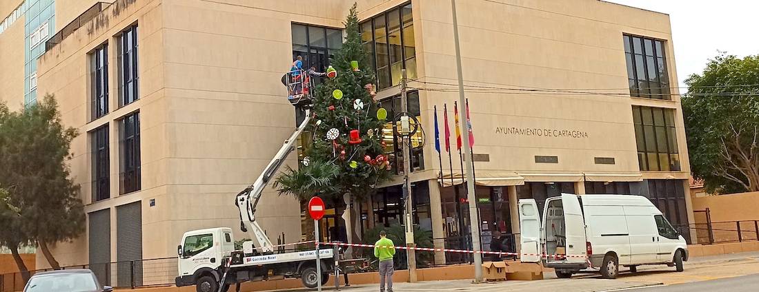 Labores de montaje del árbol 'natural' de Navidad de la avenida Ronda de La Unión, situado junto al edificio de estadística del Ayuntamiento de Cartagena.