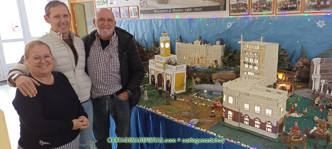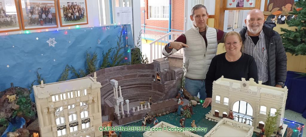 Desde entonces, cada año ha ido introduciendo un edificio emblemático del casco histórico de Cartagena. "El Belén tiene ahora el espíritu de Salzillo, que creó el suyo con elementos tradicionales murcianos", expresa el director, Francisco Alcaraz Díaz, quien nos acompaña en la visita que efectuamos al centro docente de Molinos Marfagones junto a Encarnación Pérez Cano, maestra de Religión e impulsora de esta iniciativa junto a su esposo, José Vicente García, el 'manitas' de la construcción artesanal con elementos reciclados, pues todo lo que lleva este montaje está creado a partir de cartones, latas y, entre otros, de motores de microondas o de lavadora, como el sistema del circuito del largo río. "Es de lo más complicado asegurar su curso, pues hasta que no está asegurado que no sufre pérdidas no podemos comenzar el resto del montaje", apunta Encarnación Pérez.
