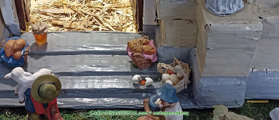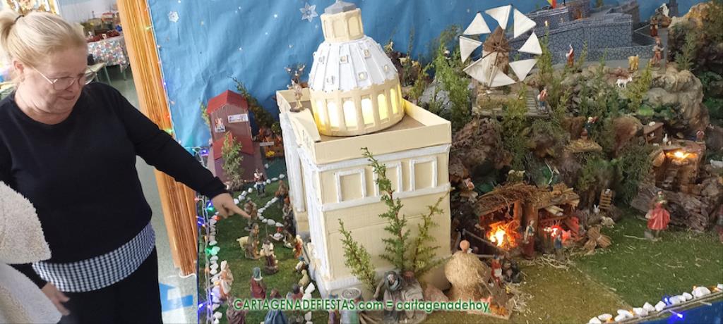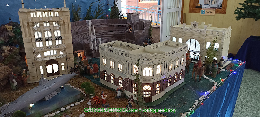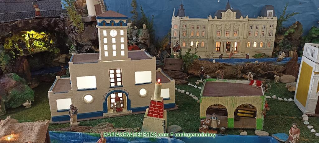 Primero fue el Arsenal y luego llegaron conocidas edificaciones del pueblo: La Barraca, el local de la asociación vecinal, la iglesia y, por supuesto, el colegio. La lista se fue ampliando con el Teatro Romano, la Catedral de Santa María, el arma submarina de Isaac Peral, el castillo de la Atalaya, el faro de Navidad, el Gran Hotel y varios más, incluida la pescadería de Santa Lucía, con una lonja en la que no faltan los precios de los productos en dinarios. Aquí cabe apuntar que en el capítulo de las figuras se ha apostado por los oficios, además de dejar plasmado el relato que comienza con la anunciación, el edicto del César para que los residentes se apunten en el censo y los vecinos acudiendo a hacerlo, en este caso, al Palacio Consistorial. Volviendo a los edificios, la novedad de este año es la estación de Renfe.