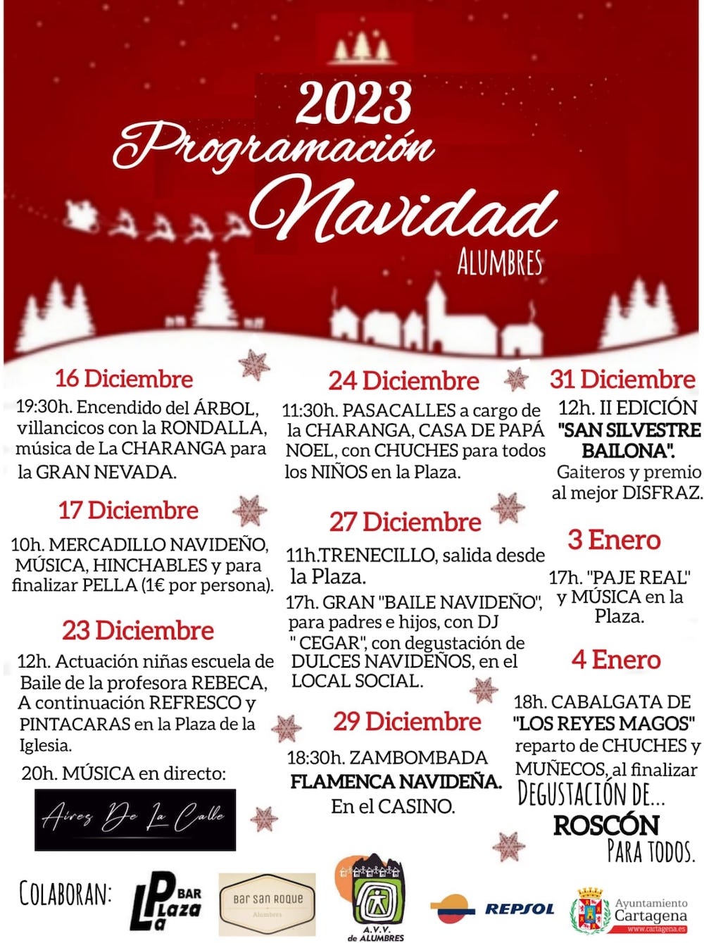 El domingo es el mercadillo con música, hinchables y arroz. Después llegarán diversos espectáculos y actividades, entre las que figuran una 'zambombada flamenca' en el casino, la visita de Papá Noel, del paje real y de los magos de Orientes (cabalgata), pasacalles, trenecillo, degustación de roscón, etc. Habrá segunda edición de la 'San Silvestre bailona' en el último día del año.