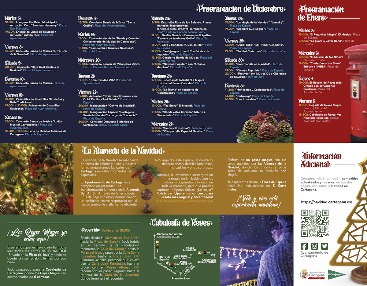 El Ayuntamiento de Cartagena y El Corte Inglés han publicado un mapa de la ciudad que muestra los puntos principales de la ciuidad para disfrutar de la Navidad. También muestra el itinerario más atractivo para contemplar la decoración navideña de las luces, incluyendo los photocalls, el muñeco de nieve de la plaza Juan XXIII o las atracciones infantiles instaladas junto a El Corte Inglés. Igualmente, enseña el recorrido que seguirá la gran Cabalgata de Reyes.