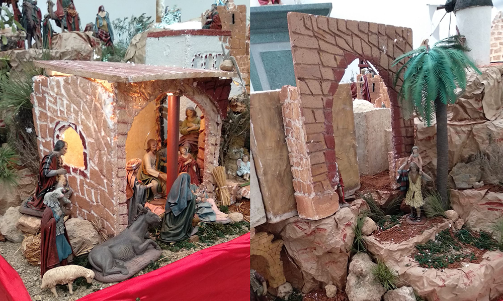 La iglesia de San Roque acoge el tradicional montaje en torno al nacimiento de Jesús de Nazaret, con numerosos detalles y una notable extensión donde hay elementos emblemáticos de esta tierra como chimeneas, castilletes o el molino de ocho velas.