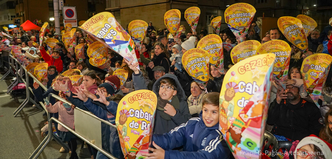 El Ayuntamiento de Cartagena, en colaboración con Ecoembes y la Asociación Región de Murcia Limpia, enseñaron a reciclar los envoltorios de los regalos durante la Cabalgata de Reyes hoy viernes, 5 de enero.