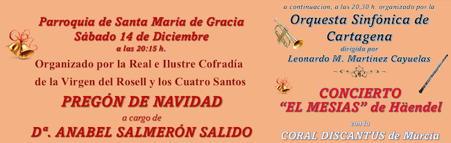 Anabel Salmerón Salido pronunciará este próximo sábado el pregón de Navidad en Santa María, lugar donde después actuarán la Orquesta Sinfónica de Cartagena y la coral 'Discantus' con 'El Mesías' de Häendel, mientras que el viernes 20 las loas en honor a la patrona contrá con la coral Iuvenis Música de Cartagena.