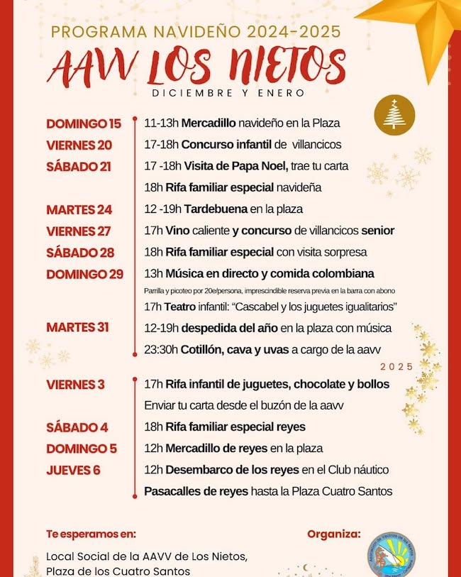 El programa de actos navideños comenzó ayer con un mercadillo en la plaza principal del pueblo marmenorense. Esta semana habrá concurso de villancicos y la llegada de Papá Noel, para en los días siguientes hasta el 6 de enero tener lugar fiestas de tardebuena y de despedida del año, música en directo, rifas, desembarco de los Reyes Magos, etc.