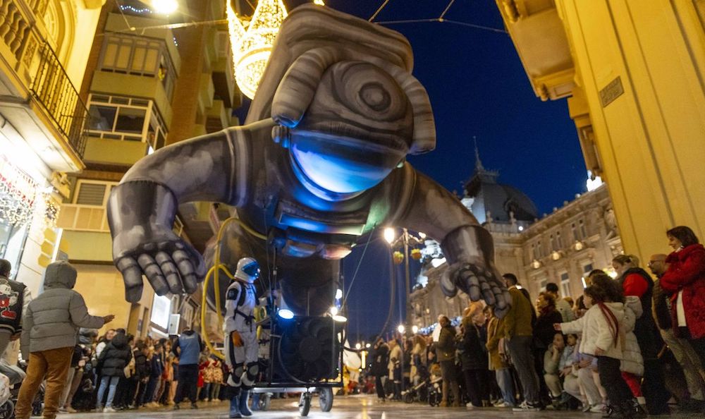 Cientos de cartageneros acudieron en familia a ver de cerca a uno de los principales símbolos de estas fiestas navideñas, con el que dan comienzo las vacaciones para los más pequeños.