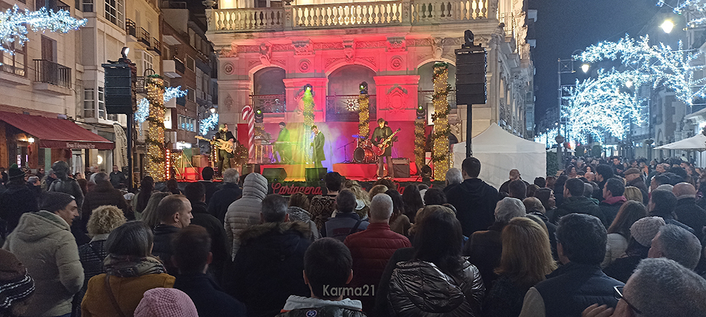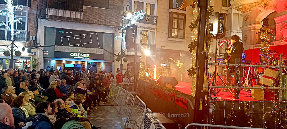 Noa Caleo, Yolanda Pedreño de Cluster Violet, Alejandro Rodríguez de Adiós Noviembre y Río Viré, se unieron a Bryan Vega al bajo, Lucas Albaladejo a los teclados, Alejandro Solano a la batería, y Roberto Lavella a la guitarra para ofrecer una amena sesión de villancicos y conocidos temas navideños, que versionaron desde el escenario de la plaza del Icue.