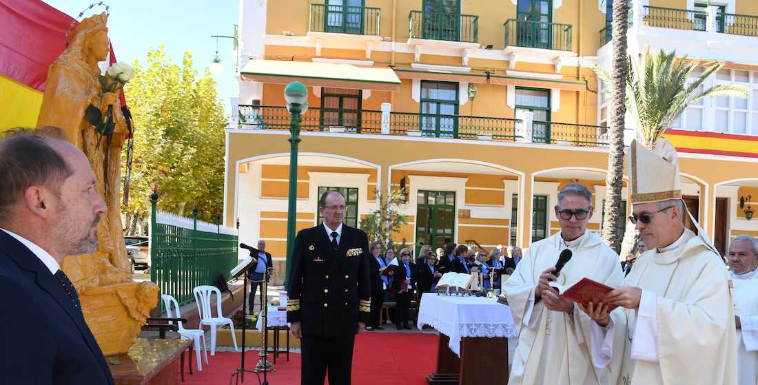 El Arzobispo Castrense de España, Juan Antonio Arnáez Cobo, ha bendecido hoy el nuevo monumento a la patrona de los hombre de la mar que ha esculpido el artista cartagenero Juan José Quirós y que se ha ubicado en la plaza de Armas del Arsenal.