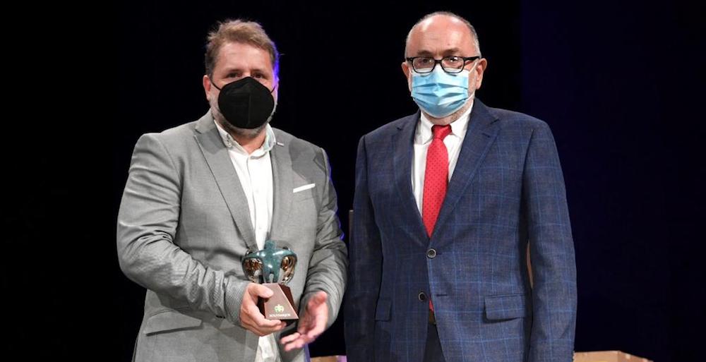 El galardón al mejor “Medio de Comunicación” ha sido recibido por José Jesús Guillén, presidente de la Agrupación de Portapasos Promesas de la Stma. Virgen de la Piedad y por José Javier Inglés, director de la revista “Arriba el Trono”.