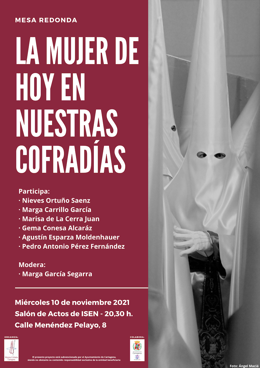 Una buena forma de saberlo está en la mesa redonda que tendrá lugar esta tarde en el salón de actos de ISEN, a partir de las 20.30 horas, organizada por la Asociación Mujeres Cofrades de Cartagena, colectivo que desde su origen trabaja por ese objetivo. “Con esta mesa redonda pretendemos dar a conocer la implicación actual de la mujer en las actividades y gestión de nuestras cofradías, así como analizar las circunstancias que favorecen o dificultan en la actualidad la igualdad entre los cofrades de nuestra Semana Santa”, exponen.