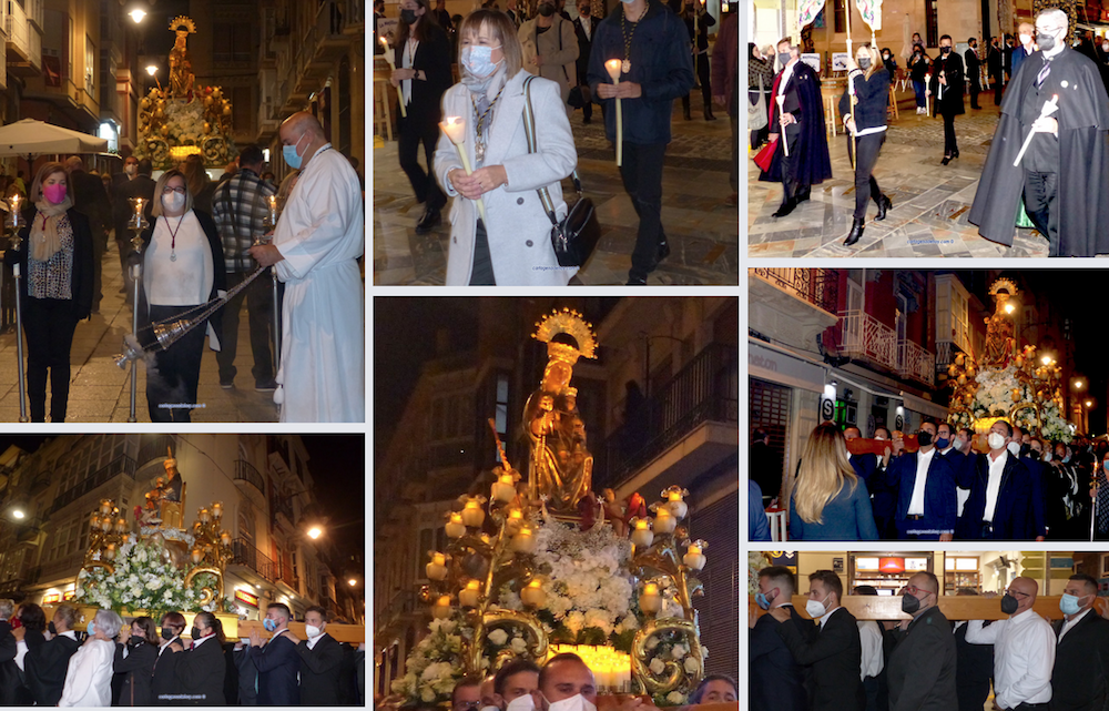 La Real e Ilustre Cofradía de la Virgen del Rosell y los Cuatro Santos está celebrando las jornadas en honor a la imagen que ostenta el patronazgo más antiguo de Cartagena, que anoche tuvo uno de sus momentos más esperados con la procesión que tuvo lugar en el entorno de la iglesia de Santa María, donde donde instantes antes se había tenido lugar una eucaristía concelebrada, siendo presidida por el vicario, José Abellán, que culminó con el rezo de consagración a la imagen y el popular canto de la Salve.